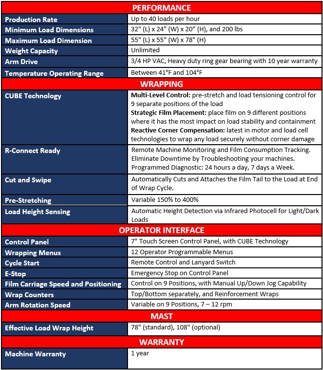 Our Rototech 708 CS stretch wrapper is perfect for heavy and unstable loads. Save time and increase productivity with the automatic cut, clamp and spreading system (CS) which keeps your operator on the fork truck. Efficient operations, reliable performance, and significant time and material savings make this rotary arm system stretch wrapper an ideal solution for your packaging line.